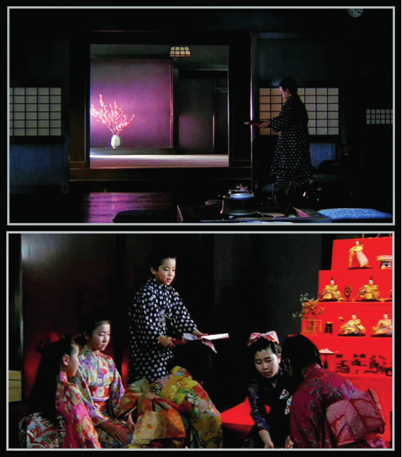 三月三桃花節也叫女兒節。五個小女孩在房間里過節。弟弟送來六杯飲料,多了一杯。弟弟說:“你們不是六個人嗎?”姐姐說他發燒了……弟弟拉開房門看見一個女孩,向她追去,來到果園,被砍的桃樹中出現了桃神,對他說:“你們把桃樹都砍了還過什么女兒節?!?/span>下圖展示的是慶祝女兒節的房間,暗調子、近似黑暗的環境。亮與暗、紅與藍形成大反差和強烈的對比。這是黑暗、煩躁、無生命氣息的空間環境。色彩展示了大自然遭到破壞后的環境形象。