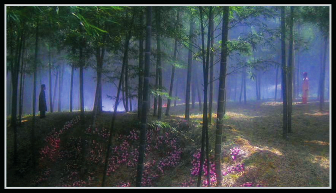小男孩的衣服是白色和服,帶有藍點圖案,系藍腰帶,整體由白和藍構成。白是純潔的色彩,暗示他長大必然要離開這個溫暖的家,離開媽媽。藍色在他的身上具有雙重含意:對母親來說藍色是不幸的色彩,對孩子來說則是成長的積極色彩。母親還撐著一把桐油黃傘。黃色是危險的色彩,刻畫母親看到孩子即將離去時刻的心情。墻檐上有陽光陰影,空中落下稀疏雨滴,正所謂“晴天漏”的景象。陰暗的灰色對比明快的調子,正是斷乳情結的色彩表現。孩子沒有聽媽媽的話,來到森林,見圖2。高大的樹木林立,陽光將雨霧染成藍色。微風中光束在閃動,既美麗又令人驚奇。藍黑色的樹干上,有一條暖色紅光,紅藍對比增加了驚奇感。小男孩的白色和服在逆光中呈現出藍色調,讓純潔的白色更加高貴。