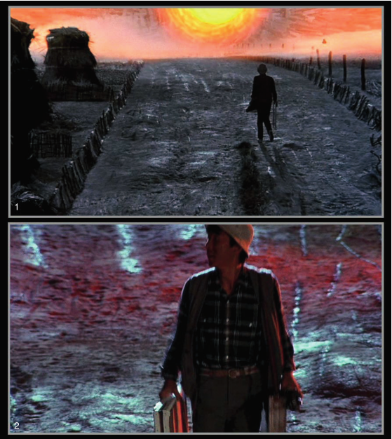 “畫中游”部分的人物色彩處理,在遠景中采用白光照明,再現出服裝本色;而在中景中,有時按“自然光三種形態”的光色理論處理人物色彩,見下圖。畫1:人物走在凡·高一幅日落時刻的繪畫里。紅色的太陽、紅色的天空、陰暗的大地,色彩強烈。畫2:俯拍畫中的青年人。日落時地面反射出紅色的陽光和陰暗的藍色天光。這些環境光在人物身上都有相應的表現。在這里,人物色彩與環境色彩渾然一體,令“畫中游”給人真實的感覺。