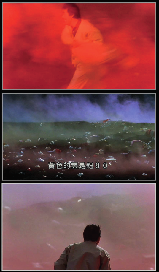 下圖所展示的是小男孩的空間。俯拍,地面一片枯黃。枯黃色是冬天樹葉的色彩,是無生命的象征色。在這里,當人們破壞了大自然,世界失去了綠色,就會變成一片枯黃。
