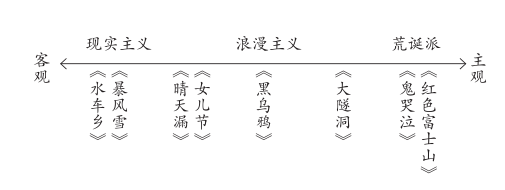 (1)題材樣式各不相同,創作方法不同,色彩處理也就不同。《暴風雪》突出暴風雪陰暗的藍色調,自然真實感很強。《水車鄉》由新鮮的綠色樹木、蔚藍色的天空、清澈藍色河水等構成,色彩沒有夸張和失真,都是自然色彩的真實再現,屬于現實主義創作方法—色彩要真實再現,又可以有主觀表現,但不能失真,不能夸張。《晴天漏》《女兒節》是童話的創作方法,色彩既真實又可以夸張。《黑烏鴉》是浪漫主義作品,人可以在畫中游。色彩既有凡·高繪畫原色面貌的真實感,又有浪漫夸張的美感。《大隧洞》是魔幻現實主義作品,色彩既要有真實感,又可以有主觀的非現實的表現。《紅色富士山》《鬼哭泣》是荒誕派作品,色彩可以“變形”,采用純主觀主義的色彩處理。