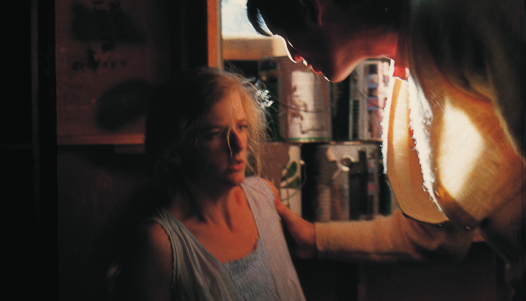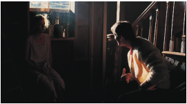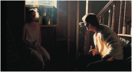 《銀翼殺手》以低調、煙霧和霓虹著稱的視覺風格影響了后來整整一代的攝影師。而除了最為著名的《銀翼殺手》,為科波拉拍攝的《佩姬·休出嫁》(1986)同樣也是喬丹·克羅嫩韋斯為人所熟知的代表作,這部作品曾為他帶來美國攝影工會獎和奧斯卡金像獎兩項大獎。在工作坊課程上,克羅嫩韋斯帶領學生們一同回顧了他如何只用一盞燈得到片中地下室一場戲的杰出效果。這部電影是《回到未來》(Back to Future,1985)和《魔鏡之旅》(Through the Looking Glass,1976)的混合體。影片情節是:婚姻不幸的女主角佩姬·休,在畢業 25 年后參加高中同學聚會;在聚會上,她興奮得昏了過去,醒來后發現自己穿越到了 60 年代,重新回到 18 歲。命運給了她重頭來過的機會,重溫叛逆青春之后,她和丈夫也重溫了鴛夢。工作坊要重現的這個場景,是重返青春的佩姬·休偷跑到父母家的地下室里抽煙。對她種種異常舉動感到費解的男朋友,也跟著她來到地下室,想當面問個清楚??撇ɡ谂臄z佩姬·休娘家場景時大部分用的是實景,是在真正的房屋里拍攝的。這就給攝影師帶來了一個棘手的問題,場地太狹小,燈光設備施展不開??肆_嫩韋思用一個簡單的辦法解決了這個問題,并在此次工作坊中重演了整個過程。“單一光源照明往往是不得已而為之的選擇。我們當時拍攝的那個地下室只有一扇窗戶,如果我在室內布光,就得藏很多小燈,不方便且效果很假,所以我想干脆只用一盞燈好了。窗戶提供了解決的方案,至少值得一試?!?/span>克羅嫩韋思在窗外支起了一盞功率是 10K的鎢絲燈,用來模擬月光。他在陰影處放煙,利用煙霧對光線的反射來提供一部分輔光,一塊正對著窗戶的小反光板用于提供更多的反光。整個場景最有趣的部分是大部分輔光都是演員自己提供的:男演員身上穿著黃色的毛衣,當他走向窗戶邊的女主角時,毛衣上的反光為女主角的臉部提供了額外的補光。演員凱特·霍爾和比爾·布雷迪重現了《佩姬·休出嫁》中的場景整個布光計劃非常大膽。攝影機與窗戶略呈夾角,窗外的 10K 燈從左至右照進室內,勾勒出樓梯等道具與布景的輪廓。煙霧提供了最低程度的輔光。女演員背對著窗戶坐在床邊,臉部位于暗區邊緣,男演員與她相對而坐,燈光勾勒出他的側面輪廓,畫面很有張力。場景的亮區過曝,而其他的區域則幾乎是全黑的。