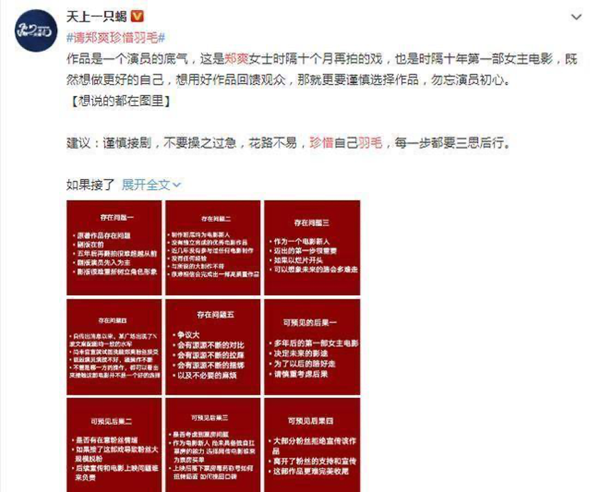 最近,周震南同款劇情也發(fā)生在了鄭爽身上。網(wǎng)傳鄭爽將出演電影版的《花千骨》,盡管在2017年電影《悟空傳》播映后,鄭爽就沒有電影方面的作品,但她的粉絲對(duì)影版《花千骨》似乎不太買賬。粉絲們列出電影存在的種種問題,還列出了可預(yù)見的后果,紛紛留言勸阻鄭爽謹(jǐn)慎接劇,愛惜羽毛,甚至更改了鄭爽微博超話頭像希望引起她的注意。