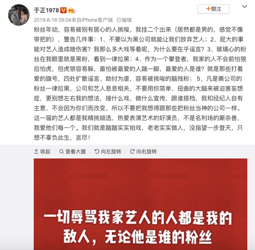 在粉絲強(qiáng)大的濾鏡之下,明星所有的好資源,都是自己的偶像靠實(shí)力爭(zhēng)取的,而所接的所有爛作品,都是經(jīng)紀(jì)公司唯利是圖的結(jié)果,偶像路人緣、觀眾緣變差,也是拜經(jīng)紀(jì)公司的不當(dāng)操作所賜。所以,為了維護(hù)偶像的形象,“事業(yè)粉”對(duì)藝人事業(yè)發(fā)展層面的“干涉”越來越多,手撕團(tuán)隊(duì)、嗆聲藝人成了家常便飯。
