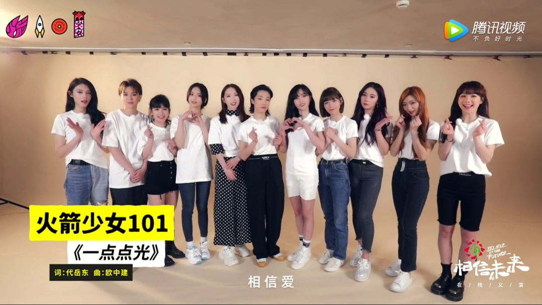 此前火箭少女101參與獻唱《愛的陽光》《一點點光》等公益歌曲,參加“90元讓一個孩子開始打網球”、“行為公益季”、“相信未來”義演等慈善活動。在成團一周年時,火箭少女101啟動了救助貧困地區失學女童的社會公益項目“春蕾計劃”。今年疫情來臨時,火箭少女101參與拍攝《同飲一江水 致敬守護者》抗擊疫情主題公益宣傳片。團員們也通過“云錄制”的形式,演唱抗疫公益歌曲《一直到黎明》,為武漢加油打氣。