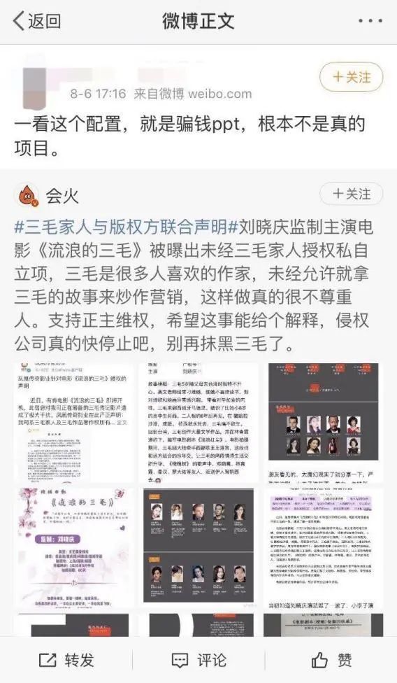 聲明還表示,鳳凰傳奇影業(yè)目前正在積極籌備三毛傳記影片《撒哈拉》(暫定名),關(guān)于影片的主創(chuàng)人員尚在保密階段,更未就此電影對外進(jìn)行任何形式的融資。鳳凰傳奇影業(yè)發(fā)出聲明后,立刻在網(wǎng)絡(luò)上掀起了一波討論。并有媒體順勢扒出了《流浪的三毛》在網(wǎng)絡(luò)上公開的項目書及演員招募信息。項目書里的信息非常精彩:劉曉慶監(jiān)制、主演(已確認(rèn)),高曉松擔(dān)任藝術(shù)總監(jiān),萊昂納多·迪卡普里奧出演荷西,姜文飾演王洛賓,關(guān)曉彤飾演青年時期三毛,更有林青霞、金星等演員參與出演。更不可思議的是項目書的最后投資回報率竟高達(dá)1200%-1800%!更有網(wǎng)友調(diào)侃:“一看這個配置,就是騙錢ppt,根本不是真的項目?!?/section>澎湃新聞、紅星新聞就此事也采訪到了《流浪的三毛》制片人馬力與主演劉曉慶經(jīng)紀(jì)人。雙方對于記者的問題都沒有正面回應(yīng)。