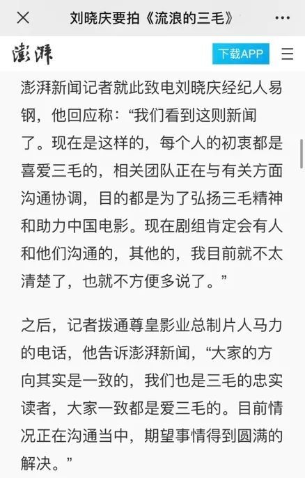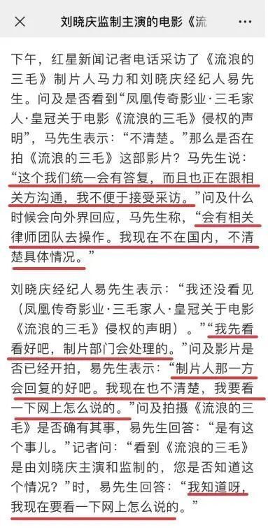 上周末,有關(guān)劉曉慶監(jiān)制主演的描寫臺灣作家三毛一生的電影《流浪的三毛》涉嫌侵權(quán)一事持續(xù)發(fā)酵。三毛家屬代表,三毛弟弟陳杰先生接受多家媒體采訪,明確表示《流浪的三毛》未獲得授權(quán),是無稽之談。劉曉慶方面和尊皇影業(yè)的馬力先生均表示“都是出于對三毛的熱愛,會與版權(quán)方溝通解決?!倍鏅?quán)方鳳凰傳奇影業(yè)則表示從未接到來自尊皇影業(yè)的任何信息。看來《流浪的三毛》未經(jīng)授權(quán)就宣傳開拍,侵權(quán)事實已經(jīng)實錘。