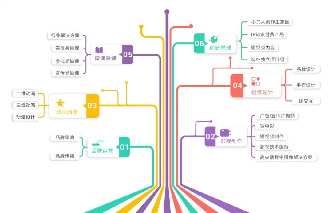如今,小二郎以重慶為總部,擁有北京、上海、杭州、成都、深圳六大影視品牌全案中心。旗下擁有“品牌運營”、“影視制作”、“動畫動漫”、“視覺設計”、“微課慕課”五大事業部。