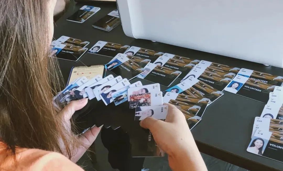 把空白的卡片放進機器里,在電腦適配的軟件上確認證件信息后,證件就會被機器從容不迫地吐出來,然后按照名字首字母分類。志愿者們的比較大的心得體驗是:FIRST的證件上可以放修過臉的藝術(shù)照。