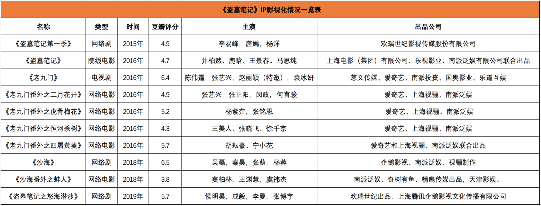 2016年,與電影公司合作的《盜墓筆記》電影版由鹿晗、井柏然主演,票房收益10億元左右。不過口碑卻斷崖式低走,電影版的劇本、特效、表演無一不想讓人吐槽,各方面都比不上2015年上映的鬼吹燈系列電影《尋龍訣》。