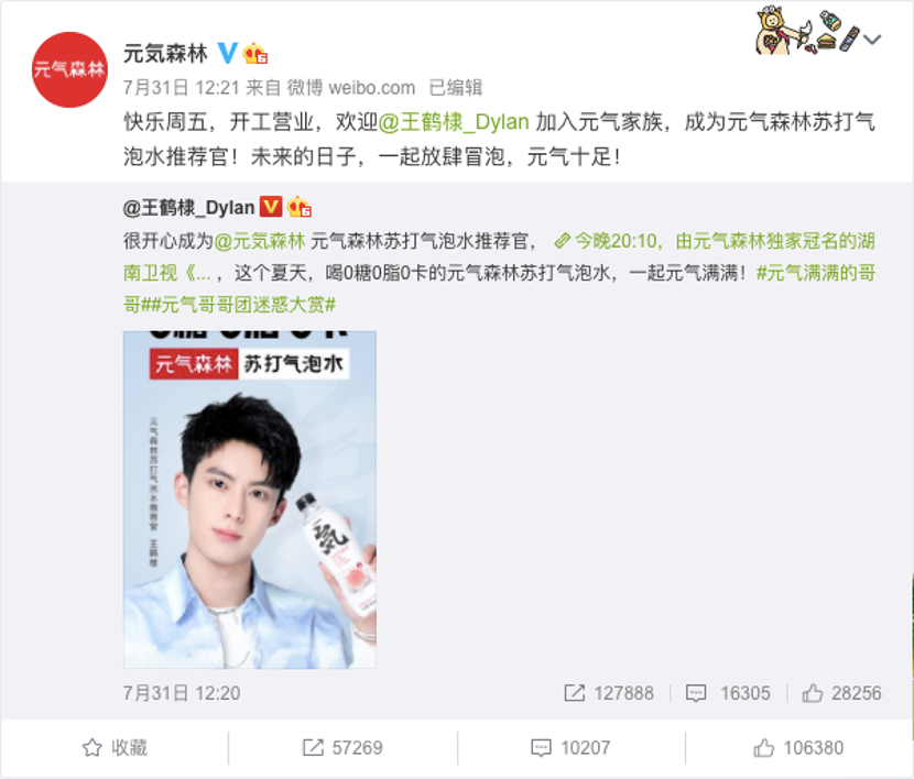 而從品牌建立至今,元?dú)馍衷跔I(yíng)銷上一直是大手筆,唐彬森曾言:“我們敢在創(chuàng)造20億收入時(shí),就掏出18億去做廣告投放。”在線上營(yíng)銷方面,元?dú)馍衷谖⒉⑽⑿拧⑿〖t書、抖音等社交平臺(tái)上都進(jìn)行了大規(guī)模推廣。