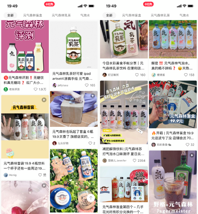 在擁有大量年輕女性用戶的小紅書上,“低糖”“熱量”“卡路里”等詞條原本就有著很高的訪問(wèn)量,對(duì)于主打“0糖0脂0卡”的元?dú)馍质翘烊坏陌l(fā)酵土壤,在小紅書APP上搜索“元?dú)馍帧保呀?jīng)有2萬(wàn)+筆記。在抖音上,“元?dú)萆帧焙汀霸獨(dú)馍帧痹掝}視頻播放量超過(guò)了8875萬(wàn)次。