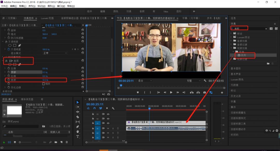 具體操作:在視頻效果里找到“裁剪效果”,將其拖入視頻素材中,隨后調(diào)整效果控件中頂部和底部的參數(shù)值就可以了,參數(shù)數(shù)值根據(jù)具體視頻字幕位置進(jìn)行設(shè)置。