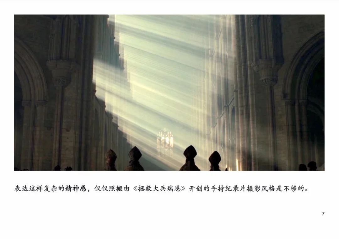 “詩”是很文學(xué)化的表達(dá),落實到具體的形態(tài),它應(yīng)該長成什么樣子?我主要是圍繞“光明”與“黑暗”兩個詞來闡述的。在說到風(fēng)格定義時,就需要提到我們的前輩《拯救大兵瑞恩》。這是我非常尊重的攝影指導(dǎo)雅努什·卡明斯基的作品,這位偉大的攝影師還拍攝了《辛德勒名單》,這兩部電影我都非常喜歡。作為同行我也非常尊敬他,但我作為一名攝影指導(dǎo)卻不能去模仿他。我們要找到自己的東西,去表達(dá)更多精神化、主觀化的東西。