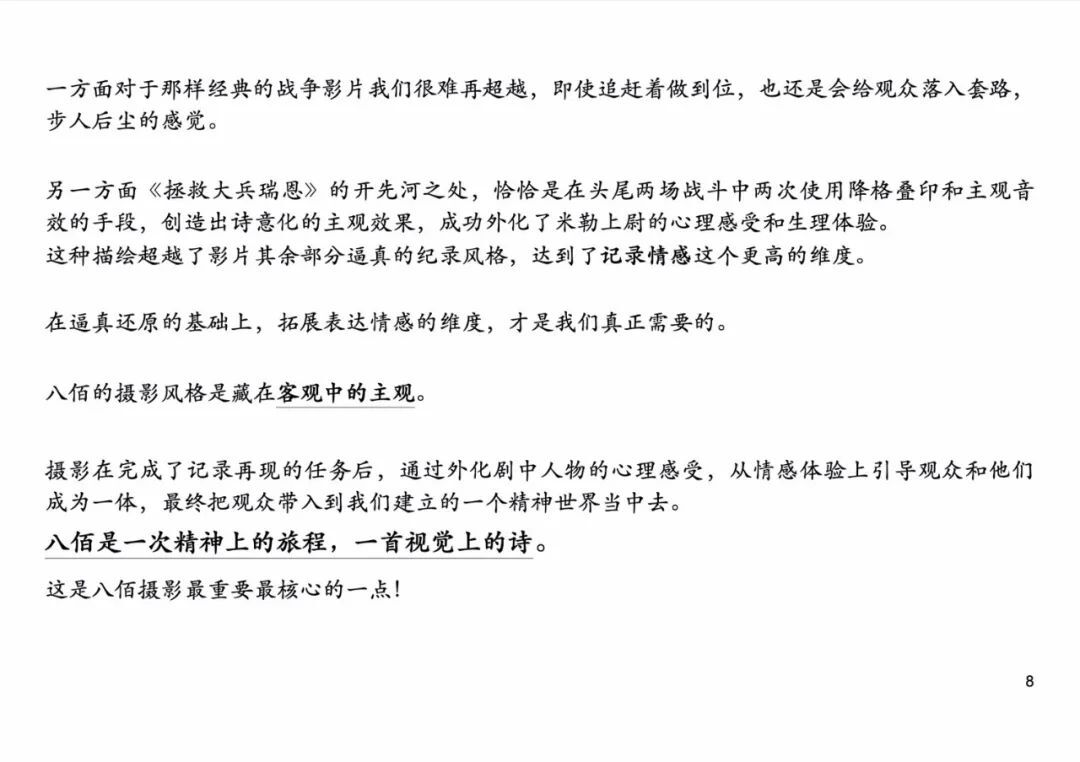 闡述,需要靠文字進(jìn)行表達(dá),更需要圖像來傳遞,只有文字無法完成這個功能。《八佰》的攝影闡述我準(zhǔn)備了幾百張圖,最后選取的都是精選后的結(jié)果。每一張圖像都有要表達(dá)的內(nèi)容,然后配上文字,給到我們的導(dǎo)演、劇組,讓他們知道我要做什么。