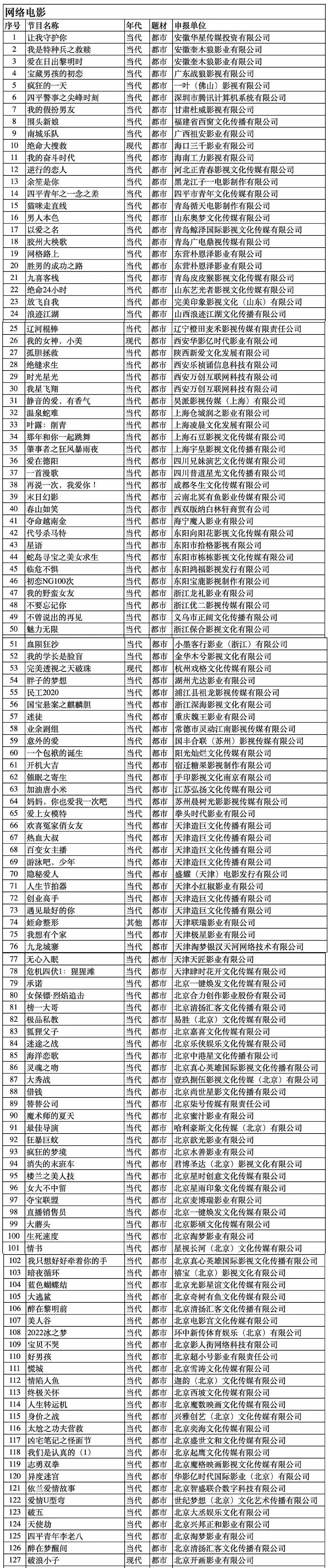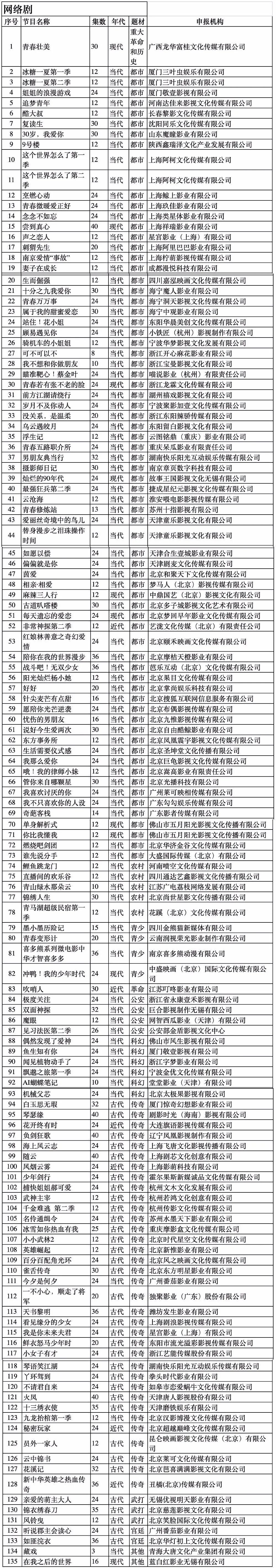 按題材劃分,網絡劇中,重大題材1部30集,都市題材72部1445集,農村題材5部76集,青少題材4部95集,革命題材1部30集,公安題材4部94集,科幻題材6部130集,傳奇題材35部882集,武打題材3部71集,宮廷題材2部60集,其他題材2部19集。網絡電影中,都市題材141部,農村題材28部,青少題材11部,民族題材1部,司法題材3部,公安題材16部,科幻題材78部,傳記題材9部,傳奇題材116部,武打題材70部,其他題材64部。網絡動畫片中,青少題材2部29集,科幻題材3部36集,傳奇題材5部28集,武打題材1部10集,其他題材4部33集。片目列表附后。