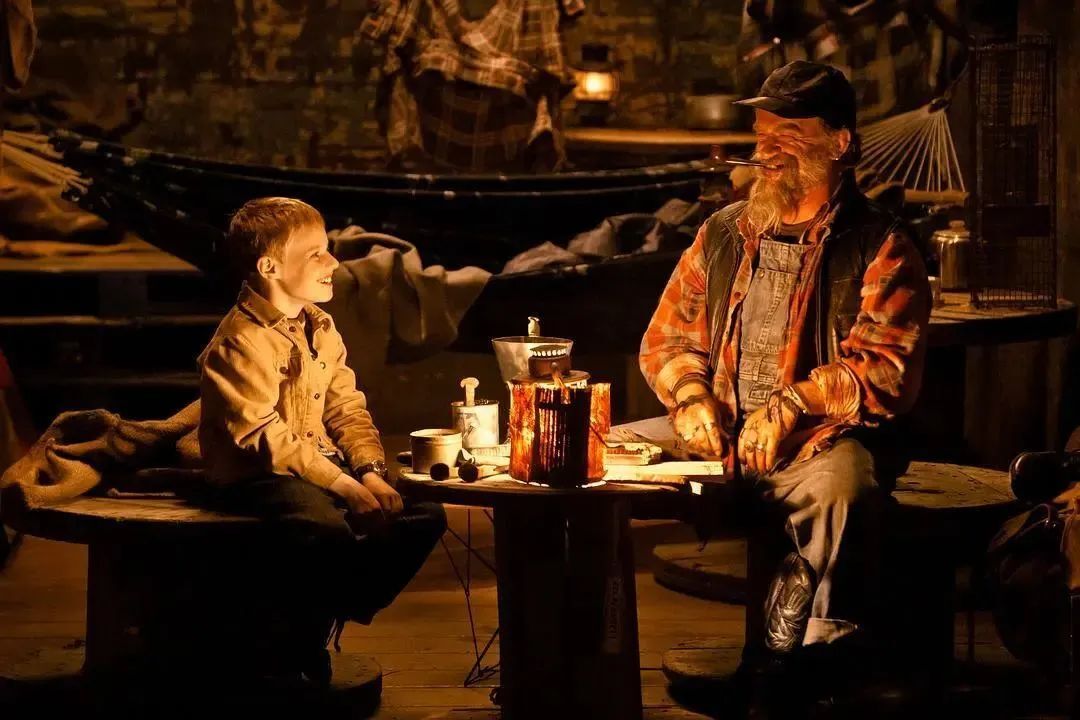 在敘事源起上,深綠色系的《佩小姐》又很像他另一部作品,明黃色系的《大魚》,都是長大后的孩子開始質(zhì)疑爸爸(爺爺)的睡前故事,那些奇幻的冒險,怪異的人物,與現(xiàn)實世界如此格格不入,《大魚》中的父子情,對應(yīng)的是《佩小姐》的祖孫情,后者在實踐上更進了一步,杰克迅速接受了色彩分明的童話世界,并找到了自己的位置,走向了遠航的成人禮。