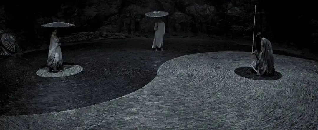正所謂“墨分五色”,張藝謀從水墨畫中尋得的創(chuàng)意,借鑒到場景和鏡頭處理上,濃淡干濕,對應(yīng)的不僅是亭臺宮闕,山水人物,別后也少不了顯而易見的中國元素。太極圖的殺場、琴瑟和鳴的曖昧,同樣是黑色,最焦干的用在權(quán)力和暴力的殺戮,最濕潤的則如似水的柔情。當(dāng)然,那些君臣身上的印染衣料歷史上并不存在,說到底這還舞臺化的虛構(gòu),或者說,把《影》看作是黑白版的《黃金甲》也未嘗不可。