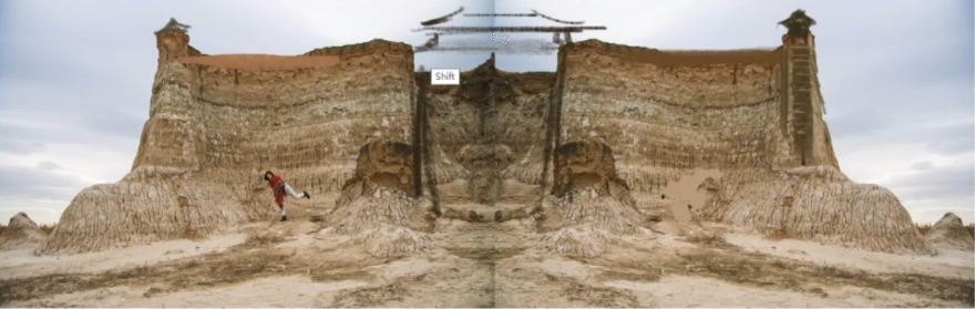 造型我做的比較簡潔,因為天空有多層云比較復雜,我想體現一個非常輕松的感覺,稍微浪漫一點,就在遠景做了一些取舍關系,像人字形的一個大概造型的建筑,用云做了遮擋,人又踩住了云,形成了這種空間的多層次疊加。