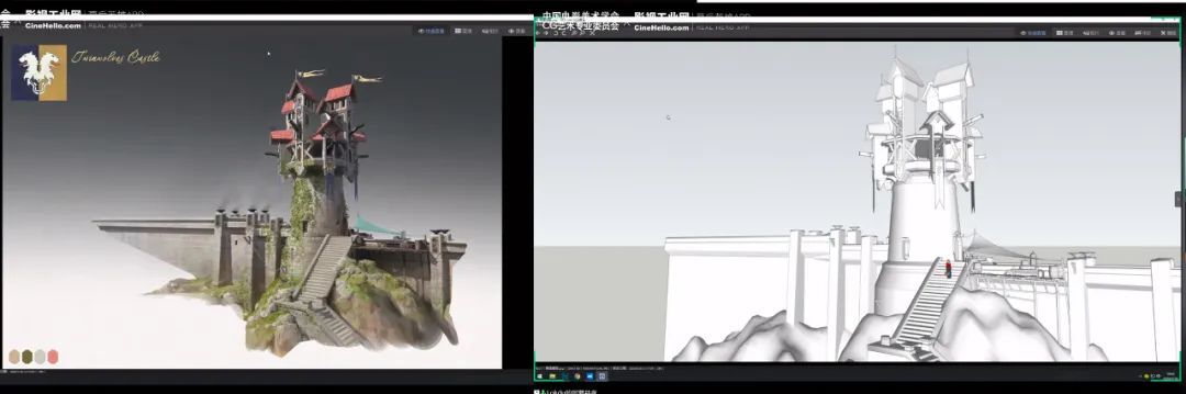 這是我給我最新的班級正在畫的建筑設計演示,一個歐洲的中世紀風格的炮塔,比如說教大家使用3D軟件進行3D建模,對于學生再去理解結構就會簡單很多,當然這更多是去針對教學,幫助學生們能夠充分地理解要學習的內容,但在我自己的繪畫創(chuàng)作過程中,我對3D其實是沒有需求的。當然軟件是有利于我對一些復雜結構的理解會更加清晰,這也是一種學習態(tài)度,所以我并不避諱,只是不常去使用。