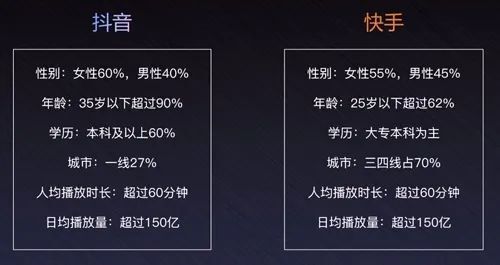 從用戶畫像來看,據(jù)企鵝智酷此前發(fā)布的《快手&抖音用戶研究報告》顯示,快手用戶一二線城市占比僅38.8%,遠低于抖音的45.3%,三四線城市占比高達61.2%,用戶下沉明顯。從學(xué)歷上看,抖音60%用戶是本科及以上學(xué)歷,快手則以本科以下用戶為主。
