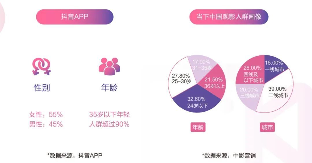 據(jù)中影營銷的數(shù)據(jù)顯示,在當(dāng)下,中國主流觀影主力人群是35歲以下的年輕人(接近80%),超過半數(shù)(55%)來自于一二線城市,比快手用戶更趨年輕化、更多居住于一二線城市的抖音用戶顯然與之人群屬性更為重合。