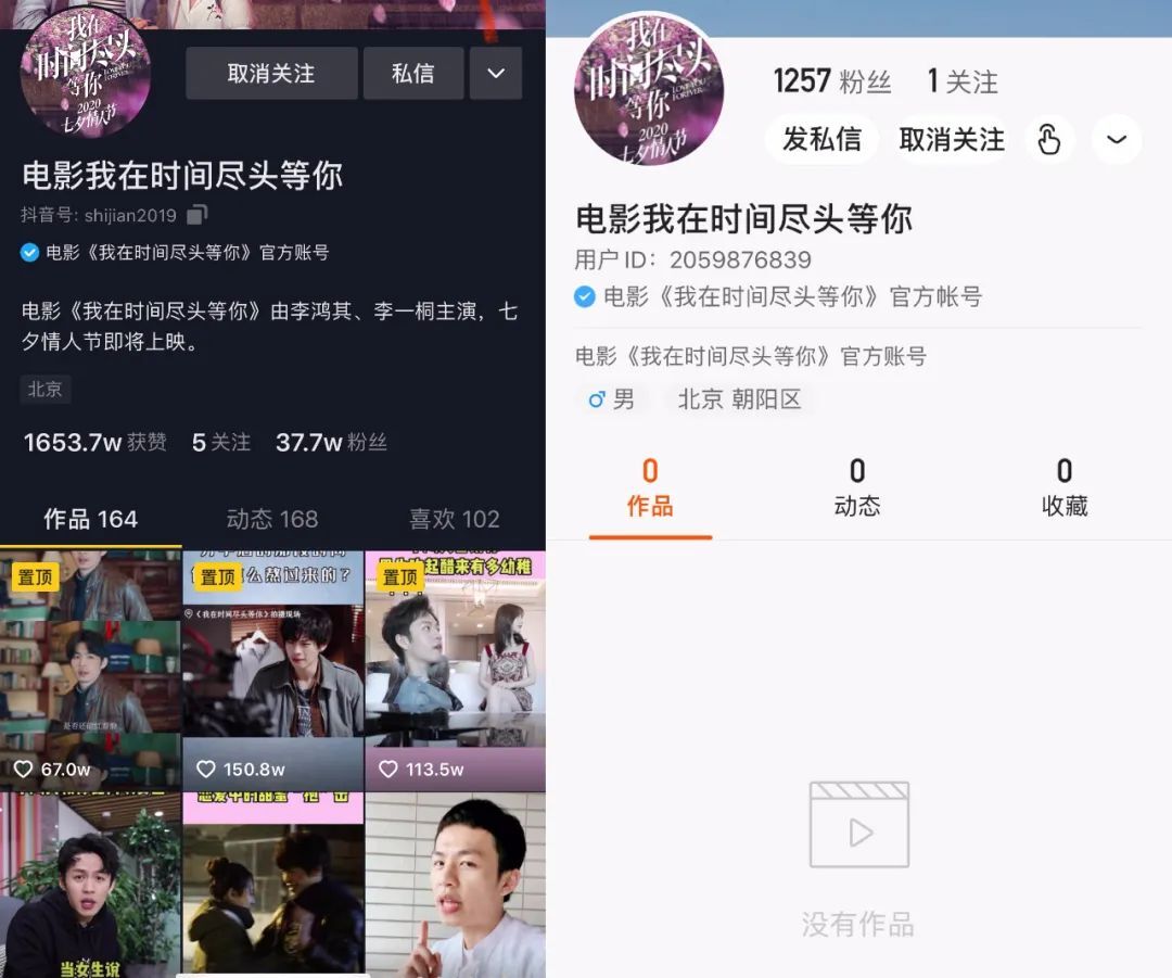 拿前段時間的七夕檔舉例,主打“都市男女情感”的《我在時間盡頭等你》選擇在抖音上鋪開營銷攻勢,同名話題下產(chǎn)出27.1w個視頻,17.0億的火爆播放量,官方賬號“電影《我在時間盡頭等你》”也成功俘獲37.7w粉絲;反觀快手,官方電影號粉絲才區(qū)區(qū)1257個,片方開號后壓根沒有發(fā)布過任何視頻。