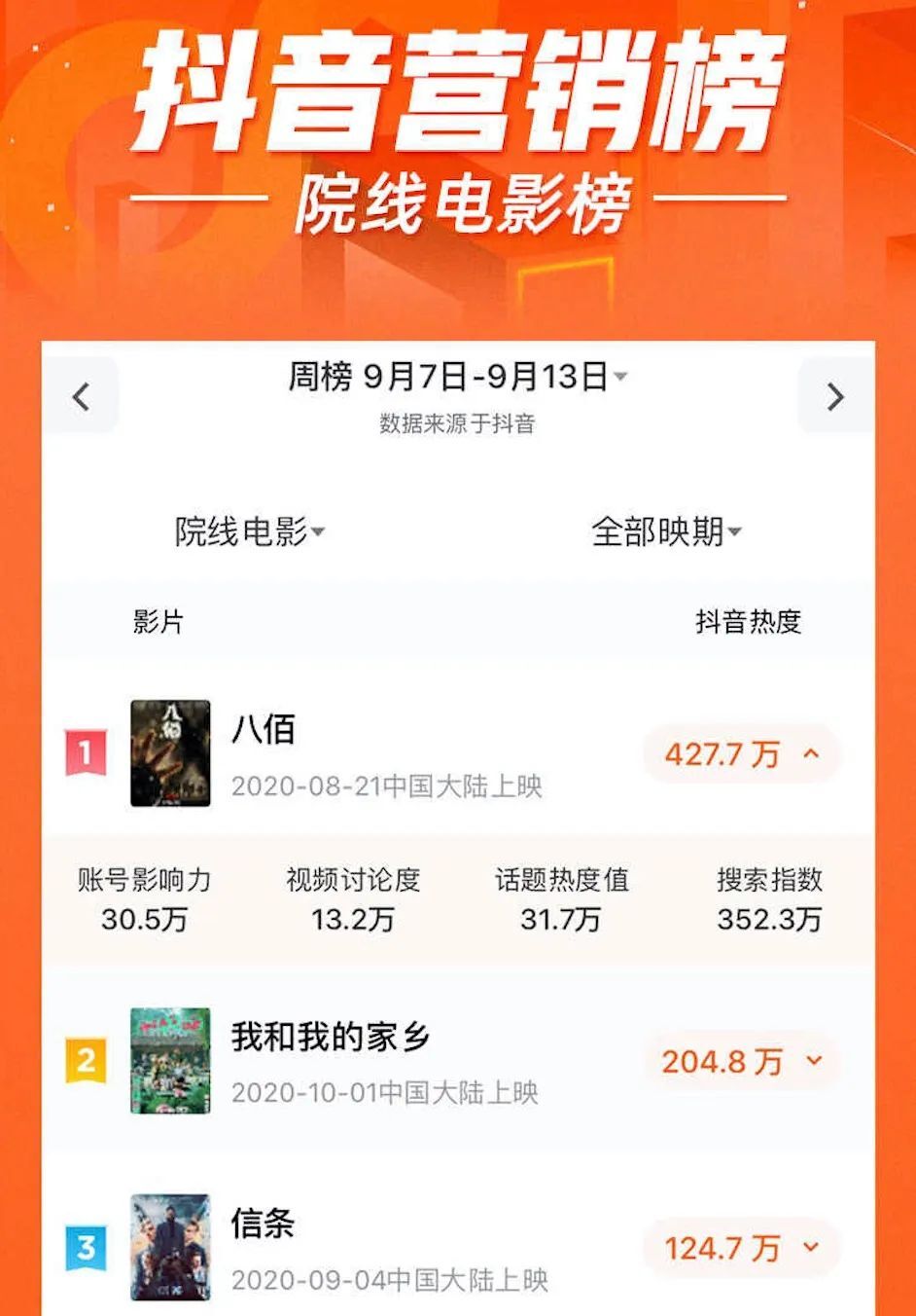 《八佰》根據(jù)男性受眾、歷史軍事內(nèi)容受眾居多的特性選擇“快手老鐵”做口碑發(fā)酵無疑是成功的,而對于一部愛情電影來講,都市男女的愛情戲顯然更適合放在抖音平臺上做安利。