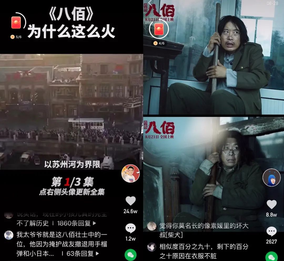 《八佰》并不只是在快手上做營銷,它也在抖音上開設(shè)官方號以及掀起熱門話題,電影八佰官抖粉絲數(shù)達205.8w,同名話題#八佰總播放量高達48億,但其后續(xù)產(chǎn)生的UGC內(nèi)容不及“快手老鐵”們的視頻豐富有趣。