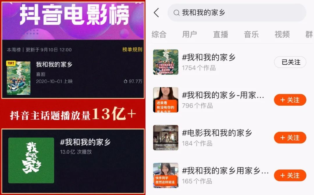 以《我和我的家鄉(xiāng)》舉例,影片在抖音上的主話題播放量在13億+,爆款視頻點贊量最高300萬+,影片憑200萬+的總熱度連續(xù)幾天登上“抖音電影榜”亞軍寶座,#王寶強劉昊然再合體、#王源 我和我的家鄉(xiāng)等衍生話題播放量都在300w+。而在內(nèi)容調(diào)性其實跟“老鐵文化”更匹配的快手上,大多數(shù)相關(guān)視頻播放量未過萬,最高的視頻播放量才20w左右,完全沒有熱度可言。