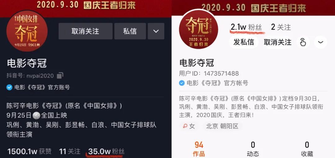 年度體育大片《奪冠》在抖音上的主話題播放量達3.2億次,相關(guān)視頻有22.2w個,而快手上同名話題下的作品數(shù)只有134個,電影官方號粉絲僅有可憐的2.1w;“封神宇宙”新作《姜子牙》的官抖粉絲有11.1w,主話題播放量為7.9億,8755個相關(guān)視頻產(chǎn)出,快手的官方號粉絲只有不到一半的5.3w,雖然話題下5w+的作品數(shù)量還算豐富,但單個視頻熱度很難見到破萬的。