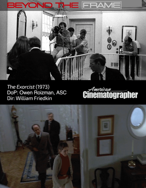 歐文·羅茲曼:我們的場景中總是有人走進大門,或者在房間中走動;并且我們大多都是從一個較低的角度來進行拍攝,一個鏡頭就能看到整個天花板和三面墻。因此,我們必須得把燈都藏起來。我們能用的燈,最大的大概就是Inkie(Altman Lighting的一款燈),只要是能藏住的地方我們都放上了一個。我們一直都在使用調光器控制它們,這樣的話如果某個演員離哪盞燈太近了,我們就能把光調低點。所有的燈都加上了網格。我們把網格放得盡可能的低,因為現場沒有足夠的空間允許我們把網格放到離燈很遠的地方。我的燈光師Dick Quinlan非常棒,他兩只手都拿著調光器,他的一個助理也是。他們會一次性操作四只調光器,就跟演奏樂器一樣。一天我開了個玩笑,把一些樂譜放在他們面前。我們偶爾也會用一些大一點的燈,像750瓦的Baby Junior(Mole Richardson的一款螺紋聚光燈),或者Zip Softlite(Mole Richardson的一款柔光燈)——但是在拍攝驅魔儀式的時候,整個現場幾乎只用到了Inkie。扮演驅魔人的Max Von Sydow和攝影師歐文·羅茲曼除了臥室之外,其他的場景中你們有遇到什么特別的燈光問題嗎?歐文·羅茲曼:整個片子拍攝中最大的問題之一,就是在喬治城大學的那座小教堂里。這座小教堂其實算比較寬敞的,有很多彩繪窗戶。弗萊德金想要用一個定場鏡頭交待一下場景內部的環境,這需要非常昂貴的照明設置,才能達到那種“自然光”的效果。劇組的工作人員們非常棒,他們把排燈架到了30英尺(約9米)高的空中——最終效果也很不錯。我們在地下室場景的拍攝中也遇到了問題,這個地下室的天花板很低,只有2米,基本沒有任何留給燈光的空間,也沒辦法拍任何搖鏡或者搭任何的軌道。如果我們用一些傳統的燈光器材,那簡直是給自己找麻煩。地下室里幾乎沒有幾盞能正常使用的電燈,我們直接把它們換成了溢光燈,這就是我們的光源,最終效果也挺不錯的。歐文·羅茲曼:有一個段落是小女孩到醫院去進行檢查,我們在紐約大學醫療中心拍攝了這場戲。我們能夠使用設施的時段是周六下午,場景是在他們日常使用的一間X光室之中,所以時間非常有限。X光室里面的空間很狹窄,真是沒有辦法放下任何的燈光器材,于是我決定用已有的光源拍攝整場戲,在這里當然就是…熒光燈。房間里的光線亮度很充足,我甚至還降低了一級光圈。一些房間中有不同顏色的熒光燈,但我們也只能碰到什么顏色的燈就就地取材。我們做的唯一調整,就是把走廊里的燈泡換成了不同的顏色,讓它和房間里的燈統一起來。最終出來的效果也非常不錯,以至于后來我們在長島拍攝一個醫生診所中的場景時,我們有足夠的空間來自由安排,但我們決定也使用場景中自帶的熒光燈。我們并沒有在窗戶上貼上濾紙來校正室外光線,而是拉下了一些遮陽簾。室內的熒光燈實在太充足了,讓我可以在鏡頭面前放上校色濾鏡,以至于我們在沖印的時候幾乎沒有進行任何的校正。這應該是我最好的一次熒光燈拍攝的體驗。那次拍攝非常容易,我們一個接一個鏡頭飛快地就拍完了。從《驅魔人》的劇照中看來,你需要為大量的夜間拍攝的室外夜景進行布光。能跟我聊聊這一部分嗎?歐文·羅茲曼:我們在喬治城拍攝了這些夜間外景,其中最困難的一場戲是驅魔師到來的這場戲。我們在深夜進行的拍攝,鏡頭從俯拍一條荒涼的、充滿迷霧的街開始。兩盞車燈在霧氣中亮起,我們看見它來自于一輛在屋子前調頭的出租車。神父走出出租車,站在小女孩的臥室窗戶發出的光亮之中。要在一扇蓋著窗簾的窗戶中拍出這種亮度是很難的,而且我們還得有足夠的亮度來打亮霧氣,讓這種迷霧的效果能夠從窗戶一直延伸到街面上。當然——果不其然——就在我們要開拍的時候,起風了。這讓霧景更難拍了。我們以最快的速度進行了拍攝,總算是拍完了整場戲。我還沒有看過影片的最終沖印版本,所以我不知道最后的效果如何,但從我在喬治城看到的每日樣片(dailies)看來——并不是在很好的放映條件下——我好像把這些室外夜景打得過亮了。這條街的外觀太好看了,我想我有些擔心損失任何的細節,所以我比往常打得更亮了一些。但我相信在合適的沖印和處理之后,成片會足夠的暗。其他的室外夜景都還挺基礎的,除了片尾的一場戲,神父從窗戶跳出去,摔下86級的階梯之后身亡。這排樓梯狹窄又陡峭,給它打光也挺難的。其實如果從效率上看,我感覺我們完成得還挺好的,我們再一次采取了類似的做法,盡可能地利用現有光源,在它的基礎上,必要之處再添一點補光。有一張場景照片中,你拍攝的時候坐在一個奇怪的裝置上,有點像秋千那樣把人吊起來。能跟我講講那是怎么回事嗎?歐文·羅茲曼:我們要拍一個三個人進入屋子大門的鏡頭,需要沖上一排有些彎曲的樓梯,一直到二樓的臥室里面。我們想要從前面開始拍他們,一直到他們走上樓梯,走過拐彎的地方,然后我們退后,讓他們從鏡頭前通過,之后從后面跟著他們一直進到臥室里。不用說,這個鏡頭是有點難度的。我們做了一個特別的椅子一樣的裝置,機械工們完成得非常出色。他們用了一個電動起重機,并且需要親自上手把操作員抬上樓梯,還得跟從兩邊出現的演員們的行動保持完美的同步。他們還要拖動整個裝置,讓攝影機跟演員保持合適的距離,還要保持平穩不要磕著屏幕…鏡頭完成得非常漂亮,有些遺憾的