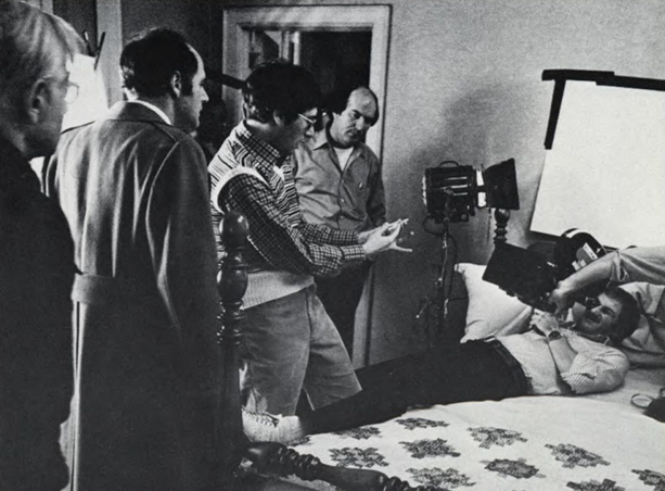 特別當弗萊德金要求的是一種“完全的寫實主義”的時候。他想要這個片子里充滿玻璃杯、鏡子和其他各種你在一個普通的房間里能夠發現的、表面能夠反光的家居用品,我們完全沒有嘗試去避開這樣的東西,而通常來說按照經驗,我們會去做一些這樣的處理。導演弗萊德金(左)和攝影師羅茲曼(右)正在準備一個外景的拍攝從一個房間到另一個房間,我得一直跟一扇扇的玻璃門做斗爭。廚房的天花板非常的低,而且是固定的。除此之外,廚房的裝潢還是不銹鋼的,一面有一扇巨大的落地窗,中間是一個帶有陳列柜的玻璃隔斷——給這個場景打光幾乎是一件不可能完成的任務。這個廚房場景最終是用兩個小小的鑲嵌在天花板上的實用燈具打亮的——就這么簡單。只要還能再塞進一點光線提亮一下人物面部,或者抬亮某個區域,我們都做了。不然我們就是走進去打開開關就開拍——因為實在沒什么選擇。這個問題可能有點傻:如果讓你總結一下你攝影的基本哲學,你會如何回答?歐文·羅茲曼:嗯…我的攝影理論非常的簡單、基礎。我的風格——如果有的話——就是去感受我的被攝物,并把它看起來應該是什么樣記錄到膠片上,而不是我想要它看起來是什么樣。換句話說,如果你去到一個骯臟、昏暗的地方,不要想方設法讓它看起來像是其他的什么地方,就把他骯臟、昏暗的樣子拍下來。如果你在一個很有美感的地方拍攝,那就努力讓它看起來像它實際上一樣美。我的方式,真的就是在膠片上去還原一個情境,不做任何改變——不是說把一個丑的東西變得美,除非是故事的需求。我的眼睛看到什么,我想要在膠片上也看到——這往往并不是那么容易實現的。你會認為近年電影技術的一些進步讓拍攝變得更加簡單了嗎?像是快鏡頭和快速膠片一類的東西。歐文·羅茲曼:噢,當然。新的快鏡頭肯定能讓你在不用做太多改變的情況下把東西拍出來,以前的話你總是需要真正打光上去才能獲得曝光——只要一打光,那看上去肯定和原來的樣子是不一樣的。現在我們拍的一些只用自然光或實用光的場景,放五年之前這樣的拍法是無法想象的。我的下一部片子《騎劫地下鐵》(The Taking of Pelham One Two Three)里大部分的場景都在地下發生。我將會盡量使用目前市面上能見到的最快的鏡頭,并用最大的光圈在已有光線條件下進行拍攝。幾年前如果我采用這種拍法,那最后我只能得到一部畫面粗糙的、充滿顆粒感的影片。我想要它看起來有點臟臟的,但不是粗糙。總結一下我們的討論,對于《驅魔人》的拍攝你最后還有什么想說的嗎?歐文·羅茲曼:我覺得弗萊德金的導演工作做得非常出色,我希望影片會是一個巨大的成功,因為他付出了很多的努力。每個參與到影片中的人都付出了很多。所有的技術人員都非常棒。Dick Smith的化妝非常出色,特效也是。TVC(一家洗印工作室)的Bernie Newson和Dan Sandberg的沖印工作也非常優秀。這部片子的拍攝極其的困難,因為片子處理的主題太不尋常了,沒有人知道應該如何去處理,因此也經歷了很多試錯的過程。有時我們以為拍到的東西很好,但放映的時候卻發現并非如此,我們不得不重頭再來。我們必須不斷地去處理一些非常特殊、少見的問題。但每個人都做出了自己的貢獻,并在超常的壓力下了不起地完成了工作。但有幸和如此有才華的演員們合作,再大的壓力都值得了。羅茲曼憑借他在《驅魔人》中的工作獲得了奧斯卡最佳攝影的提名——此《驅魔人》外,他還憑借《法國販毒網》《窈窕淑男》《電視臺風云》《義海傾情》等影片獲得過這項榮譽。為表彰他對電影藝術做出的貢獻,2018年的奧斯卡金像獎將終身成就獎頒給了他。讓我們一同來回顧一下他的杰出工作:
