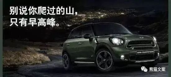 有一句流傳很廣的金句,“別說你爬過的山,只有早高峰。”來自MINI COOPER。從表達和概念來看,這句的確很好。它將早高峰比擬成山,將上班族疲于奔命的窘境變得形象;它用每天擠早高峰的高頻場景,去和更多人產生關聯,激發共鳴。