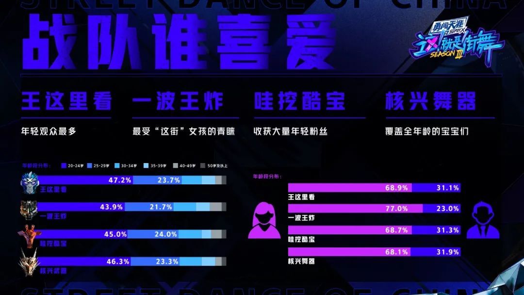 《洋布拉德》中,王嘉爾撕裂上衣秀出健碩肌肉,將代表“王這里看”戰隊的新生代風格淋漓詮釋。從編舞到服裝王嘉爾全程參與,這也助力他獲得戰隊秀排名第一。而王一博在《The End Game(最后一戰)》中與“一波王炸”隊員布布、楊凱配合Hiphop、Breaking雙人組合技,招式切換間引發瘋狂尖叫。“哇挖酷寶”戰隊集體打造派對舞《WOW!酷寶派對》,鐘漢良將鹽甜、性感多種情緒動感呈現,激情舞步打動人心:“我找到了最初堅持練舞的開心感。”張藝興再度用編舞和音樂呈現摯愛的中國風,古琴輕彈、紅綢舞動,“核興舞器”的《炎黃子孫》飽含著張藝興的深意:“我想通過舞蹈的藝術,去表達生長在我們骨血里的驕傲!