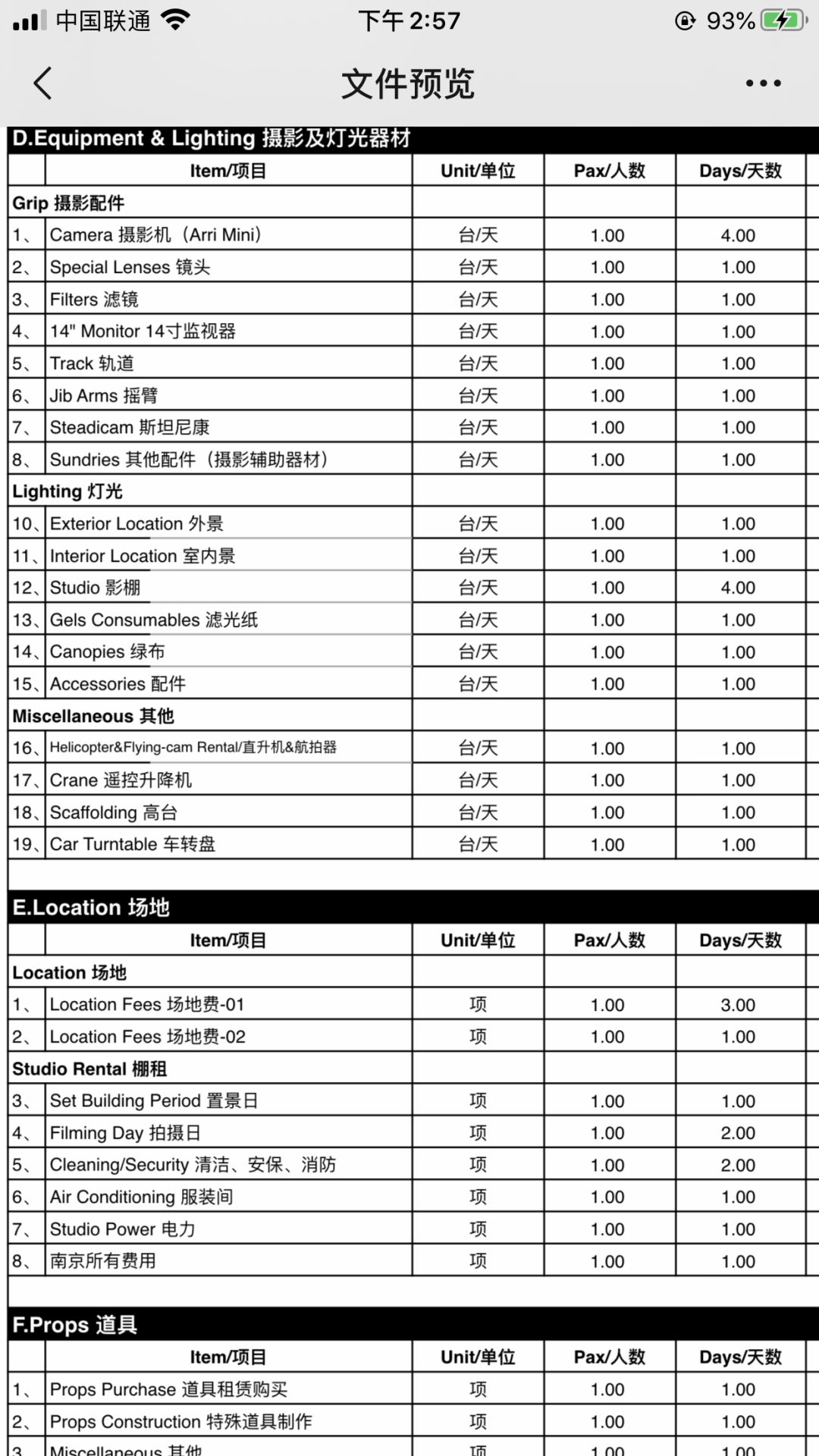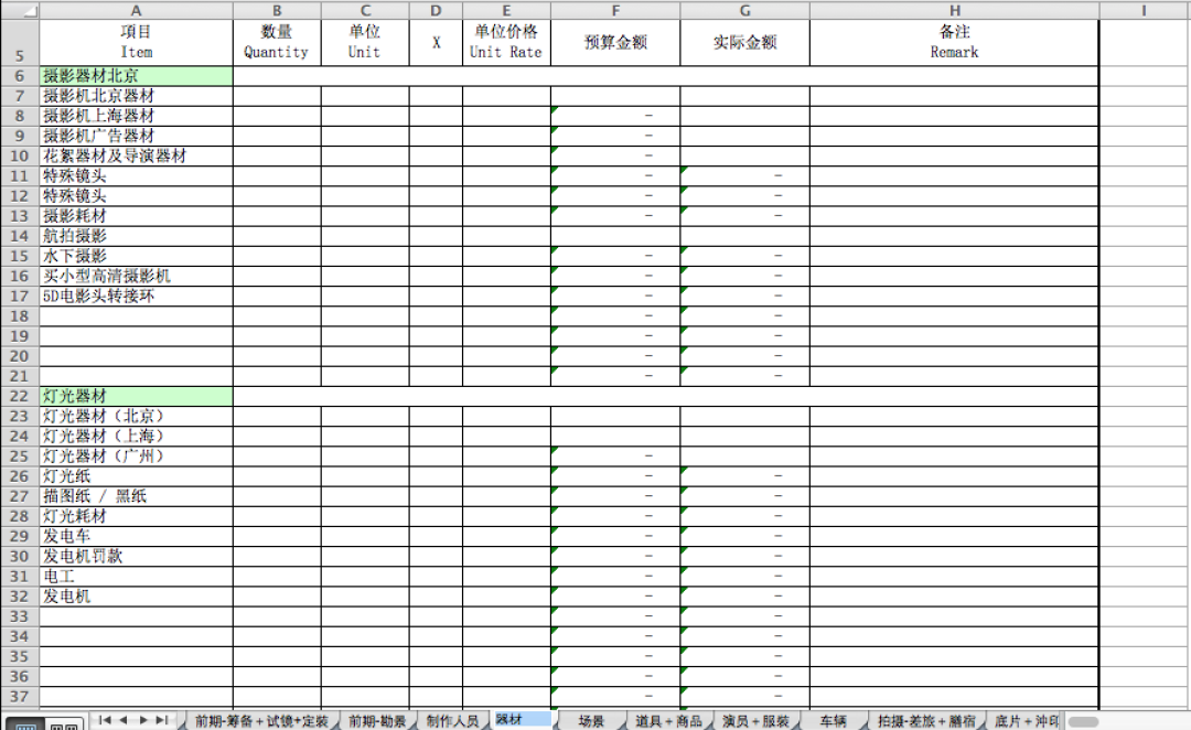 第一個(gè)特點(diǎn):“對(duì)各部門都有一定的專業(yè)浸入度”(用一段真實(shí)對(duì)話,來道出真實(shí)觀點(diǎn)。)年輕制片:迪姐你的組,制片是怎么控制預(yù)算的?我(對(duì)年輕制片):我能聽進(jìn)去的只有一種聊法……來點(diǎn)專業(yè)的!我(笑):我某次合作的制片,希望省一套變寬鏡頭,他先找到我問——導(dǎo)演,這部戲你可以考慮后期剪裁成2.35:1嗎?不出變寬鏡頭的話,主場(chǎng)景規(guī)模可以做的大一倍。主場(chǎng)景拍的是頭尾兩場(chǎng)大戲,我理解既是劇情開篇又是揭示謎底的畫面……對(duì)你的分鏡來說,是不是主場(chǎng)景的規(guī)模更重要一些?我:準(zhǔn)確的說法是——大家一起來判斷。(稍頓)那我作為導(dǎo)演,是看分鏡腳本更需要什么…我:他跟攝指說——導(dǎo)演想保大場(chǎng)景,可以接受后期剪裁畫幅。不出變寬。我:攝指糾結(jié)了……因?yàn)橹鲌?chǎng)景大也利于畫面。于是,他倆聊完的結(jié)論……攝影個(gè)人關(guān)系找兩顆變寬鏡頭(笑)。具體我也沒細(xì)問,結(jié)果好就忙下一個(gè)事情了。不過別小看這兩顆鏡頭,連續(xù)拍攝多日是能省下一筆費(fèi)用的。我:也沒大一倍。(思索)擴(kuò)大3分之一吧……再大就浪費(fèi)了!尺寸算得準(zhǔn),大家也都接受。沒人再回去說鏡頭的事情……拍片嗎總有問題需要解決,新的問題覆蓋了舊問題,這事就過了。制片人:能聊到點(diǎn)子上,錢才能花到刀刃上。我:是的。跟導(dǎo)演談創(chuàng)作思路;跟攝影談?dòng)檬裁寸R頭;跟燈光師能聊多少k的燈就夠了;跟美術(shù)能算置景的具體尺寸等。年輕制片:每個(gè)部門的技術(shù)都懂……這樣的制片多嗎?我:我在拍攝廣告的10年里,遇到的制片基本都能做到。廣告時(shí)長短,每個(gè)環(huán)節(jié)都要精準(zhǔn)……包括控制預(yù)算。年輕制片:有機(jī)會(huì)拍下廣告,感覺很細(xì)致很專業(yè)。我:專業(yè)度是一種能力。一名好制片,能控制好10支廣告片的預(yù)算——也能控制好一支電影的預(yù)算,反之也要成立。就像職業(yè)的導(dǎo)演能拍好長片,也能駕馭短片和廣告。(稍頓)職業(yè)與否,專業(yè)與否不需要按圈子來劃分。自己要做到職業(yè)化,專業(yè)化,能揚(yáng)長避短,又善于合作,還善于取經(jīng)。(笑)有廣告拍廣告,有劇情片拍劇情片……腦中推演千百遍,不如實(shí)拍一次漲經(jīng)驗(yàn)。年輕制片:姐,我感覺你對(duì)廣告制片很認(rèn)可!我:我對(duì)廣告圈有感情。打個(gè)比方,如果廣告圈是我的家鄉(xiāng),我理解的回家看看是……衣錦還鄉(xiāng),共同富裕。我:衣錦還鄉(xiāng),共同富裕,多年一次,畢生回味。我(笑):看似在“搞事情”,其實(shí)是垂直在自己的領(lǐng)域。說白了,有能力的人都是心有桃花源,身在奔波中。導(dǎo)演是,制片也是。這碗深夜的“雞湯”——信息量包括:制片的專業(yè)度如何評(píng)定/制片如何巧妙控制預(yù)算/制片與不同主創(chuàng)談判的技巧/行業(yè)間善于取長補(bǔ)短……我們就不展開了。有興趣可以二刷對(duì)話,再讀一遍。多說一句,人常說制片就知道省錢。可在我看來制片教會(huì)了我怎么花錢。很多時(shí)候從結(jié)果上看——舉例1 :制片出的預(yù)算單(器材項(xiàng))(空表格)舉例2:制片出的預(yù)算單(器材項(xiàng))(截取部分表格)第二個(gè)特點(diǎn):“對(duì)危機(jī)事件的處理能力”這part我們來講一個(gè)小故事,是拍片現(xiàn)場(chǎng)的插曲。故事中的制片我只合作一次,但印象極為深刻。(沒舉例熟人。想以一見百,讓大家體會(huì)第二項(xiàng)優(yōu)秀能力的普遍性)一支廣告影片需拍攝在雨中奔跑。出于廣告公司對(duì)我作品的認(rèn)可,以及制作公司的推薦——我想全力拍攝好這支廣告。所以,合作的是業(yè)內(nèi)數(shù)一數(shù)二的攝影師。攝影師出于對(duì)創(chuàng)作的負(fù)責(zé)——開出了匹配的燈光器材。可是——燈光費(fèi)用超支,決定了其他部分要省錢。制片的安排已經(jīng)很周全了,他選擇了一個(gè)比較偏遠(yuǎn)的攝影棚來節(jié)省費(fèi)用,以便挪給燈光部分。原計(jì)劃是大家少睡一會(huì),多花一點(diǎn)時(shí)間在路上,但是……千算萬算偶有一疏,那個(gè)不常去的攝影棚電壓不是很穩(wěn)定。一般的拍攝用燈沒問題,碰上我們這組精益求精的用燈數(shù)量……問題就暴露了。拍攝日狀況——上午斷電三次。百密一疏——發(fā)電車沒在棚里。按照rundown是9點(diǎn)半開拍,凌晨3點(diǎn)收工。實(shí)際上,到下午1點(diǎn)還沒拍上一個(gè)鏡頭……可想而知,現(xiàn)場(chǎng)氣氛越來越緊張。隨著時(shí)間的流逝,大家都坐不住了。(預(yù)設(shè)開機(jī)時(shí)間——9;30)(預(yù)設(shè)收工時(shí)間:第二天03:00)所有人都在擔(dān)心影片質(zhì)量和預(yù)算爆掉。每個(gè)人都以各自的方法盡力保質(zhì)又不超預(yù)算。但制片處理危機(jī)的方法很巧妙,既能抓大又有細(xì)節(jié)。他一方面打電話解決/調(diào)配發(fā)電車……另一方面,把打電話之外的時(shí)間花在干活上。具體干什么呢?他什么都做!只要能盡一份力他都第一時(shí)間去做,跟各部門助理搶著做。淋雨做測(cè)試,放道具,做光替,帶演員……他穿梭在攝影組/燈光組/美術(shù)組/拍攝區(qū)/導(dǎo)演區(qū)/客戶區(qū)/棚外(打電話)…
