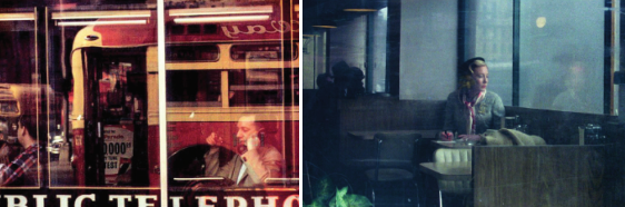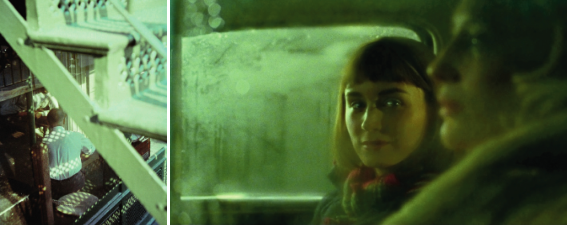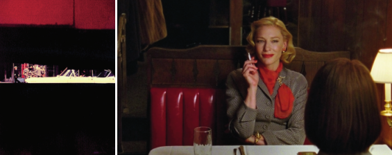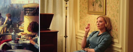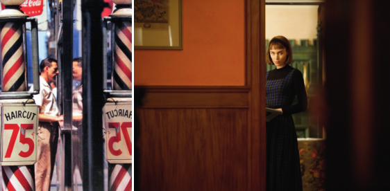 電影《色·戒》(左)與其借鑒的上海老月份牌(右)2016年的中國電影影像也出現(xiàn)了一些值得關注的變化。《我不是潘金蓮》的圓形構圖引來巨大爭議,對觀眾而言這是一次全新的銀幕體驗,對于創(chuàng)作者同樣是一次富有想象力的嘗試。在此之前,中國的電影影像誠然滿足了敘事、技術、氣氛營造的基本功能,但在影像美學上自成體系、留下印記的作品甚少。《我不是潘金蓮》的意義不在于提供了一個可供模仿的范本,而是讓我們欣喜地看到中國攝影師對“影像概念”的積極探索。那么什么是影像概念?在給影像概念下定義的同時,我先就它與風格、靈感的差異進行辨析。首先,影像概念不是影像風格。風格是藝術作品在整體上呈現(xiàn)出的具有代表性的獨特面貌。在某些情況下,風格是不自覺的,甚至是被動形成的。有時候,它是后人根據(jù)作品藝術特點總結出的、相對穩(wěn)定的美學特征。影像概念則是攝影師與導演在電影籌備之初,就自覺地對影像預先設定的一整套創(chuàng)作依據(jù)與規(guī)則。影像概念也不同于創(chuàng)作靈感。靈感是靈光乍現(xiàn)的念頭,它解決問題的方式是點狀的,不具有系統(tǒng)性。影像概念可能起源于星星點點的靈感,但它是完整的、獨立的系統(tǒng),是經過實驗檢測后可行的創(chuàng)作體系,在實際拍攝中得到遵循,以期在成片中獲得與設想相近的整體風格。在創(chuàng)作前預設“影像概念”,并以之為準則進行創(chuàng)作——在中國影像創(chuàng)作中,這還是個不多見的手段。但綜觀全球電影,國外影像創(chuàng)作者已經做出不少成熟的示范。在電影學院攝影系的課堂上,王競(北電攝影系主任,導演作品《萬箭穿心》《大明劫》)讓學生根據(jù)三個維度(敘事依據(jù)、美學依據(jù)和工藝支撐)來尋找使用“影像概念”的創(chuàng)作案例,接下來介紹的案例來自攝影系學生的搜集和整理。影片《雨果》改編自布萊恩·瑟茲尼克的小說《雨果·卡布里特的發(fā)明創(chuàng)造》,小說以梅里愛的生平為基礎,講述了12歲男孩雨果的奇幻故事。小說的情節(jié)類型為影片的影像風格提供了基本的敘事依據(jù),即這是一個兒童視角的、帶有奇幻色彩的浪漫故事。此外,攝影師羅伯特·理查森(Robert?Richardson)從同名繪本的插圖以及歷史照片中尋找視覺參考。原作書中有一幅真實歷史攝影照片 — 1895年的蒙帕納斯火車站,一列火車失控地撞進了火車大廳。影片通過部分綠幕重建、微縮模型以及數(shù)字場景的方式還原了這一驚心動魄的場景。《雨果》影像背后的美學依據(jù)來自對“奧托克羅姆”(Autochrome)技術的復古效仿。該技術由盧米埃爾兄弟于1903年發(fā)明并申請專利,是20世紀30年代以前主要的彩色攝影技術。“奧托克羅姆”是一種加色合成的微粒彩屏干版,其構成原理為在玻璃板上涂布被染為橘色、綠色、藍紫色(當時盧米埃爾兄弟選定這三種顏色為三原色)的淀粉顆粒,并在淀粉顆粒的空隙中加入炭粉,再涂一層全色性乳劑在上層。染色淀粉顆粒層與乳劑層融合充分,在顯微鏡下可顯示,每一個染色淀粉顆粒都包裹著鹵化銀乳劑。感光時,每一個顆粒相當于一個個小濾鏡,吸收并透過相應顏色的光,因而限定了成像時色彩的種類,形成較為突出的色彩傾向。左:放大狀態(tài)下的染色淀粉顆粒;右:運用該技術拍攝出的泰姬陵“奧托克羅姆”因為當時的色彩工藝尚不完美,而形成了特殊的時代風格,《雨果》效仿的正是這種色彩傾向明顯、過渡色被削弱的成像效果,設定出符合時代記憶的影像概念。攝影師自制了一套“奧托克羅姆”LUT系統(tǒng)(LookupTable,簡單地說是一個視覺轉換模型),并且將之貫穿于整部電影。“我們限定特選區(qū)域的色調范圍,所以它們呈現(xiàn)出來就更像單色色塊?!?攝影師說。綠和品紅被抑制,橘黃與青被凸顯,因而整個畫面呈現(xiàn)出強烈的冷暖調對比,創(chuàng)造出了如夢般的氛圍。它同時也帶來了間離的效果,觀眾可以深刻地體會到這不是對現(xiàn)實的觀照,更像是坐上了重回梅里愛時代的時光機。影片《卡羅爾》(Carol,2015)根據(jù)派翠西亞·海史密斯的小說《鹽的代價》改編,描寫20世紀50年代紐約兩個女性的愛情故事。影片選擇在俄亥俄州辛辛那提市進行拍攝,以還原時代風貌。導演托德·海因斯(Todd?Haynes)和攝影師愛德華·拉赫曼(Edward?Lachman)在為影片尋找視覺參考的時候,曾研究過50年代頗為風靡的“情節(jié)劇”風格,但后來認為其夸張、飽和度過高的色彩以及人工痕跡偏重的燈光、鏡頭設計不利于展現(xiàn)本片微妙的女性情感。討論過后,他們決定把索爾·雷特(Saul?Leiter)的攝影作品以及繪畫作為主要影像參考之一。索爾·雷特是20世紀美國抽象表現(xiàn)主義畫家,同時也是“紐約派攝影”成員之一。導演海因斯與攝影師拉赫曼在上一次合作 — 拍攝《幻世浮生》(Mildred Pierce,2011)時,就已經做過類似的嘗試,《卡羅爾》的影像可以說是創(chuàng)作者在視覺美學探索上的延續(xù)。索爾·雷特擅長用框架構圖,拍攝被空間分割的人物。藏匿于櫥窗、車窗、門框之后的視點,帶著一種看似疏離的窺伺感?!巴ㄟ^讓觀眾看到部分模糊的角色,我們試圖表達人物之間的脫節(jié)以及支離破碎的身份”,攝影師愛德華·拉赫曼說??蚣艿恼趽?,展現(xiàn)出兩人空間的逼仄甚至分裂,暗示著特