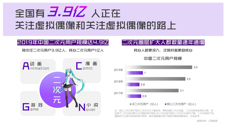 初音未來、洛天依等虛擬人物的現(xiàn)象級成功,讓大家看到了年輕人對虛擬人物的熱切需求,以及國內(nèi)虛擬人物市場巨大的潛力。據(jù)艾瑞咨詢數(shù)據(jù)顯示,全國有3.9億人正在關注虛擬藝人和在關注虛擬藝人的路上,95后至05后二次元用戶滲透率達64%,2020年Z世代年輕人預計將占據(jù)所有消費者的40%。二次元與三次元之間存在著巨大交集。