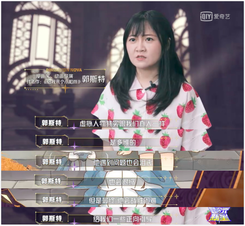 與此同時,節(jié)目也通過次元星們個性的綻放以及業(yè)務能力的不斷提升,向當下年輕人傳遞勇出敢自信、不斷提升自己的正能量價值觀。就如同首期節(jié)目中漫畫家、動漫導演郭斯特說的:“虛擬人物其實跟我們真人一樣,是多維的,他遇到問題也會沮喪、退縮,但最終他會遇到困難,給我們一些正向的引導。”