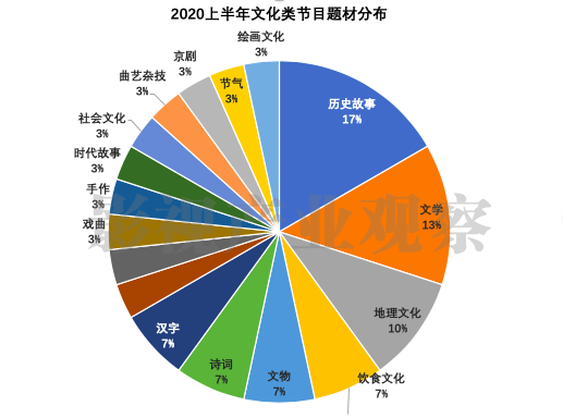 據(jù)統(tǒng)計(jì),2020年上半年文化類節(jié)目中前三大題材分別是歷史故事、文學(xué)和地理文化,三者都達(dá)到了10%以上;第二梯隊(duì)為飲食文化、文物、詩詞和漢字,均為7%。在這之中,地理文化和飲食文化是新興的兩種題材,《你要去哪兒》《我的城我的歌》《探世界》等對城市鄉(xiāng)鎮(zhèn)進(jìn)行探訪,《非遺美食》《家宴》等聚焦于中國的傳統(tǒng)美食。