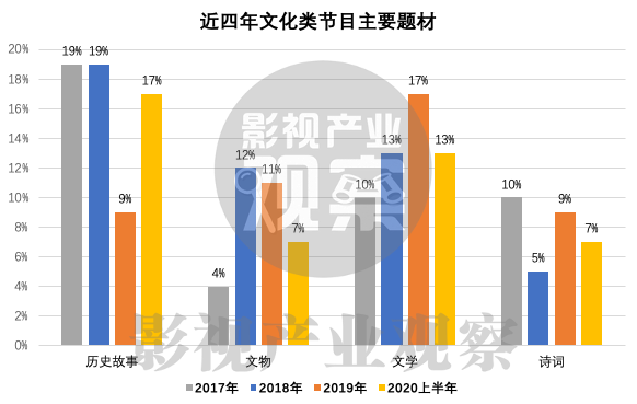 綜合近四年數(shù)據(jù)來看,歷史故事、文學(xué)、文物、詩詞是文化類節(jié)目最主要的題材。占比最高的歷史故事在2019年下降后今年上半年再次回升,其余三個題材則均有減少的趨勢。這些數(shù)據(jù)背后,是文化類節(jié)目的發(fā)展已經(jīng)進(jìn)入了演替的階段,易操作的歷史文學(xué)類題材的優(yōu)勢地位還在,一度熱門的文化交流、時代故事、家風(fēng)題材等逐漸消減,新題材開始涌現(xiàn),一直以來存在的同質(zhì)化現(xiàn)象有望得到進(jìn)一步改善。