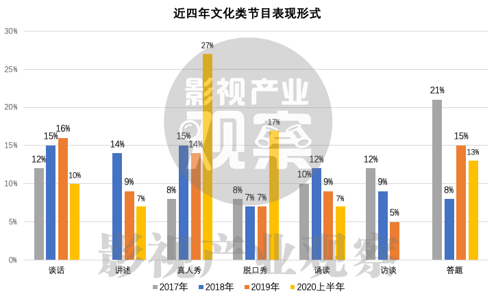 在表現(xiàn)形式上,2020年上半年文化類節(jié)目以真人秀、脫口秀、答題為主,綜合四年數(shù)據(jù)來看,真人秀、答題和談話是最主要的表現(xiàn)形式。其中真人秀占比不斷提升,越來越多的節(jié)目讓嘉賓走出演播室實(shí)地探訪,并將文化與游戲環(huán)節(jié)相結(jié)合,讓高冷的文化類節(jié)目更加生動有趣。比如北京衛(wèi)視相繼開發(fā)的故宮、天壇、頤和園IP,以及由燦星制作打造的《了不起的長城》等,都是典型代表。