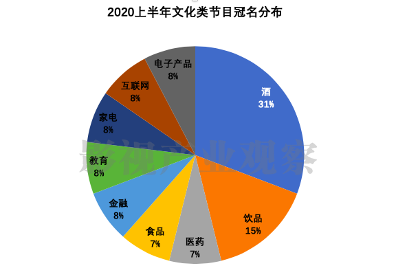 從冠名商的行業(yè)分布來看,2020上半年文化類節(jié)目冠名主要集中在酒類和飲品,《經(jīng)典詠流傳3》《我在頤和園等你》《一桌好宴》等節(jié)目都是由酒類冠名。綜合四年數(shù)據(jù),酒類主要是白酒從2018年起就以極大優(yōu)勢穩(wěn)坐文化類節(jié)目冠名第一把交椅,占比都達(dá)到了30%以上,累計(jì)冠名了30余檔文化類節(jié)目。