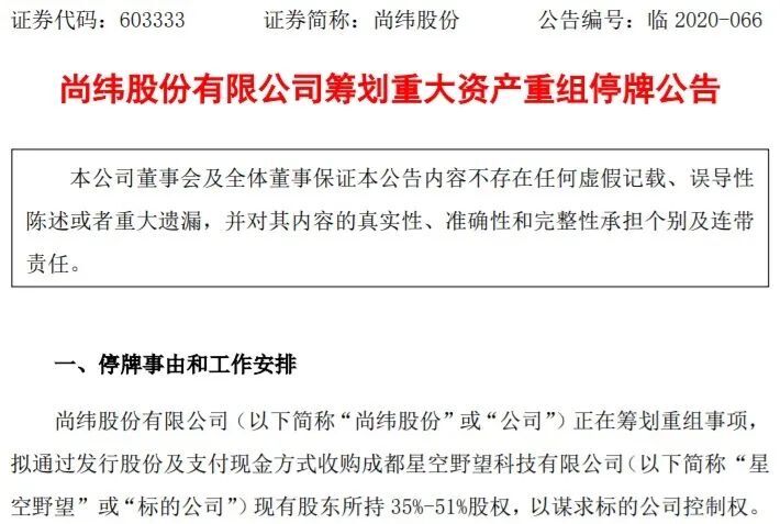 尚緯股份10月26日晚公告稱,公司籌劃重組事項(xiàng),擬收購(gòu)成都星空野望科技有限公司(簡(jiǎn)稱“星空野望”)現(xiàn)有股東所持35%-51%股權(quán),以謀求標(biāo)的公司控制權(quán)。雖然星空野望成立僅半年,但卻是羅永浩直播電商業(yè)務(wù)最重要的運(yùn)營(yíng)主體。