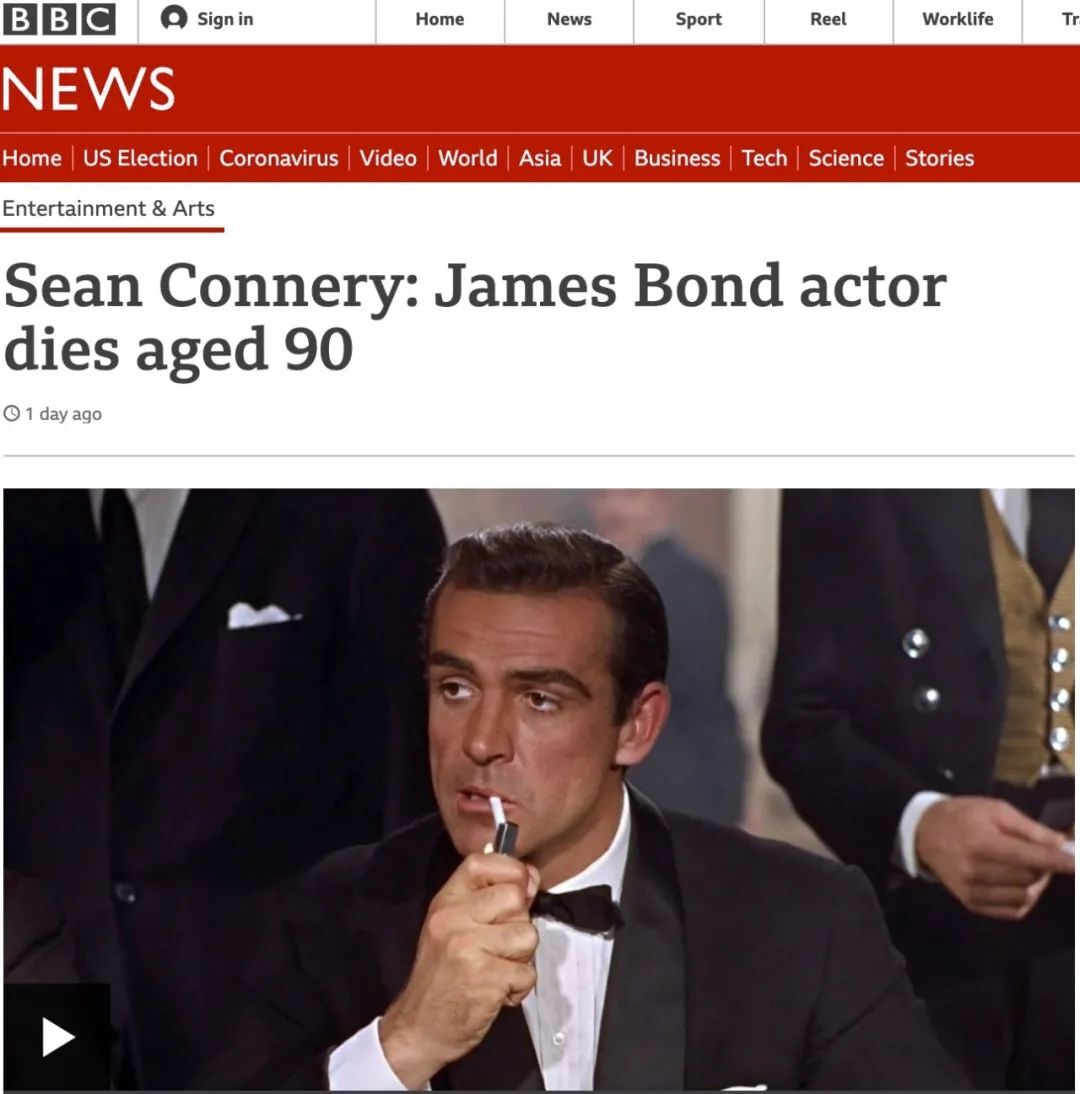 一代英國巨星肖恩·康納利去世,享年九十歲。