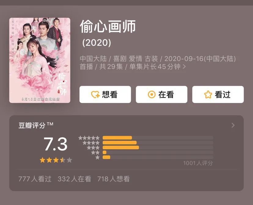 縱然市場每個月都會涌現出好幾部甜寵劇,但是真正有口碑、有熱度的卻不多,對比之下,優酷推出的古裝愛情輕喜劇《偷心畫師》頗為亮眼。該劇是由阿里影業、萬合天宜聯合出品,柯政銘執導,夏寧駿、曦子、藍博、康可人、田書臣等聯袂出演。盡管男女主都是新人,總投資也不大,但該劇成功開辟了一條小清新差異化路線,讓觀眾有輕松、清爽、活力的觀感,豆瓣評分高達7.3分。