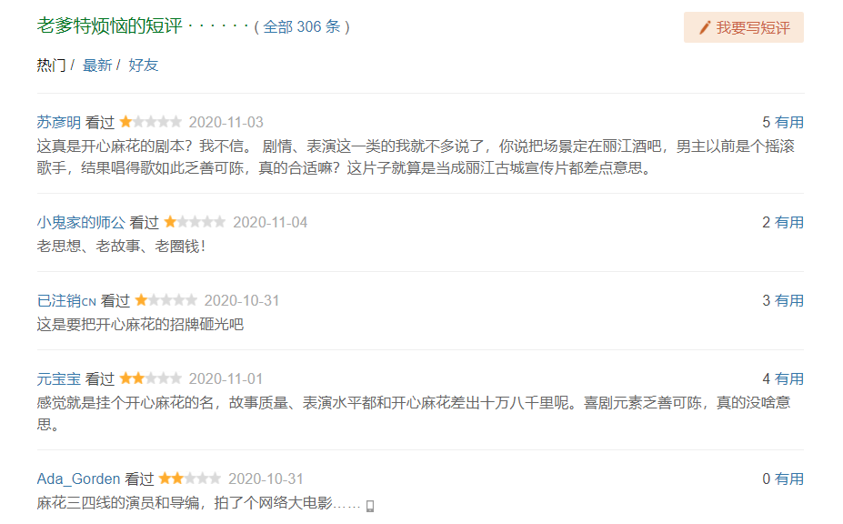 《老爹特煩惱》是一部主打父女情感的公路喜劇。一部學生作業(yè)級別的平庸之作,在網大市場上可能并不少見,但作為開心麻花的跨界首發(fā)未免草率。影片掛了開心麻花的招牌還套了“XX特煩惱”的句式,里面卻沒有相應的明星熟臉,許多人點進來深感上當,反彈格外猛烈。