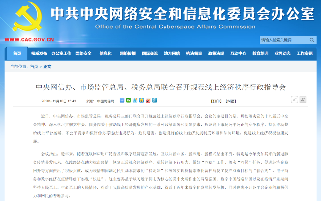 近日,中央網信辦、市場監管總局、稅務總局三部門聯合召開規范線上經濟秩序行政指導會。會議的主要目的是,貫徹落實黨的十九屆五中全會精神,深入學習貫徹黨中央、國務院關于推動線上經濟健康發展的一系列政策部署和明確要求,規范線上市場公平公正的競爭秩序,持續推動整治線上平臺壟斷、不公平競爭和假冒偽劣等違法違規行為,趨利避害,創造良好的線上經濟發展制度環境和法制環境,促進線上經濟積極健康發展。