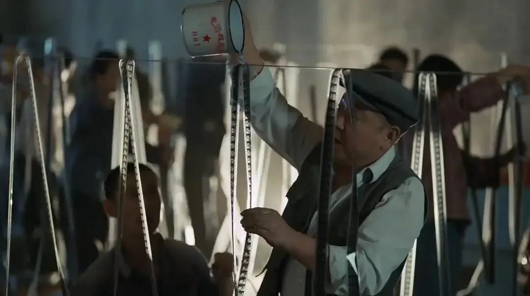 其一,對電影實體,即剪切、重組和剝奪的權力。實際上,對膠片的剪切和剝奪從來都是權力的一種直接體現,比如在意大利導演朱塞佩·托納多雷的名作《天堂電影院》(Nuovo Cinema Paradiso, 1988)里,所有的接吻鏡頭都被從成片里去掉,放映員艾佛特成為了當時意大利南部審查制度的實際執行者。在影片結尾,多多收到了艾佛特留給他的一件珍貴禮物——所有接吻鏡頭的組接——這份禮物串聯起整個影片的主要情節,不僅是一份珍貴的童年回憶,也是一份失落的愛情,更是一份失落的電影文化記憶。從這個角度上說,《一秒鐘》正是張藝謀版《天堂電影院》:范電影(范偉飾)同樣將珍貴的兩幀膠片截取下來送給張九聲(張譯飾),而這張膠片最終又被二分場的暴力機構保衛科剝奪。
