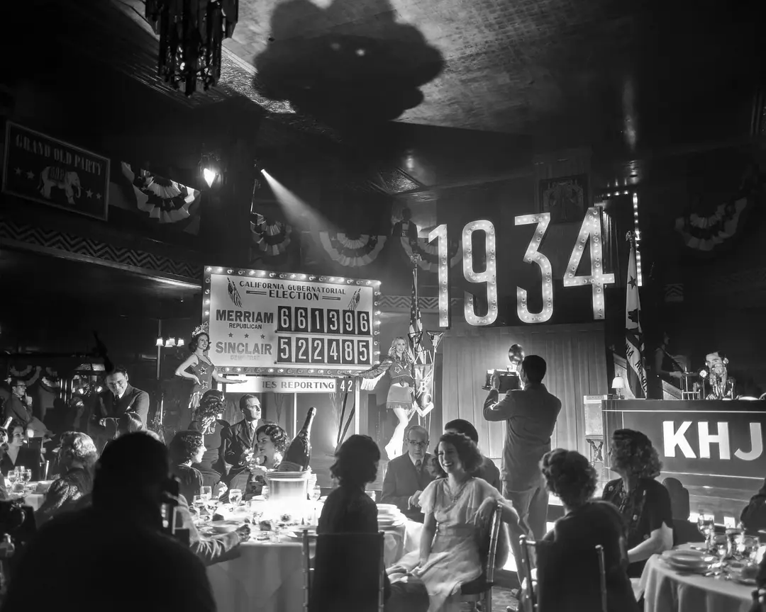 漫長的前期工作在《曼克》的一場戲中終于得到了回報。這是一場打光極具戲劇性的、選舉之夜派對的戲。梅塞施密特與Burt緊密合作,一同設計出了整個場景該如何結構與進行布光,很大程度上這一切都是在Burt 的概念設計的基礎上實現的。這一場戲由在幾張桌子上的對話組成,大部分都需要實用光源來打亮。一塊特別定制的、布滿燈泡的“1934”的招牌,以及桌上的臺燈,都是場景中最大的主光源。